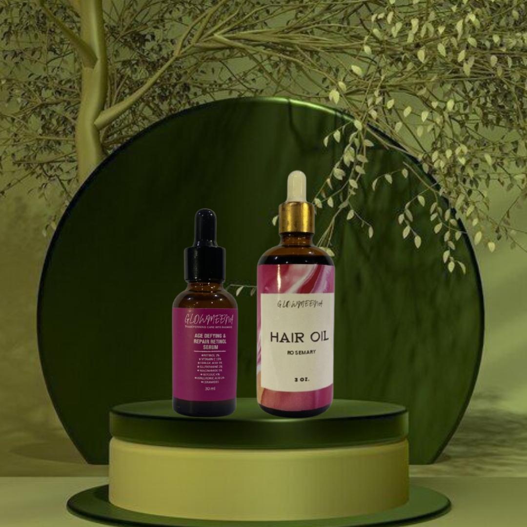Discover your new beauty essentials with GlowMeeth’s Age-Defying & Repair Retinol Serum and Rosemary Hair Oil. Picture this: your skin feeling smoother, firmer, and glowing with every use of the retinol serum, as it works to fade fine lines and bring back that youthful radiance. At the same time, imagine running your fingers through stronger, shinier hair, thanks to the rosemary-infused hair oil that nourishes your scalp and encourages healthy growth. Both products bring a touch of nature’s goodness to your routine, leaving you feeling refreshed and confident. GlowMeeth is here to help you look and feel your best, naturally. Treat yourself—you deserve it!